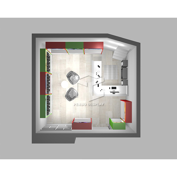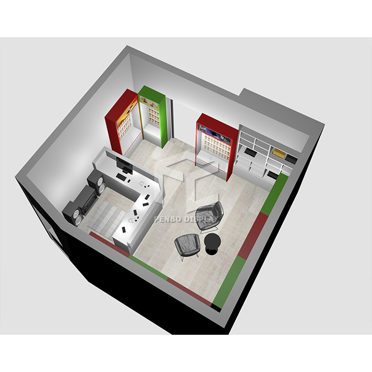 Dit is de 3D tekening van telefoonopslag. Er zijn muurvertoningen en tellers in de opslag.
