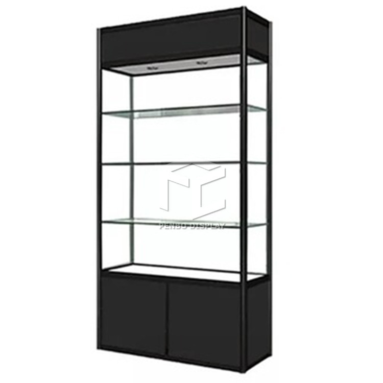 Het Alumiumkader kan in zwarte of andere aangepaste kleur worden gemaakt. En het opslagdeel bij de bodem is facultatief. De glijdende afsluitbare glasdeur met sleutel handhaaft veiligheid van de producten u aantoont. Het is super pratical en geschikt voor uw opslag.